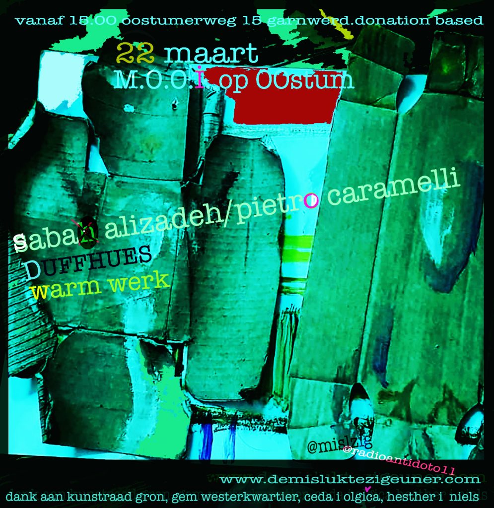 zondag 22 maart mogen we Saba Alizadeh, Pietro Caramelli en ( niels) DUFFHUES verwelkomen, met warm werk van Ivonne ( en Cyril) en soep van Svasso, natuurlijk.