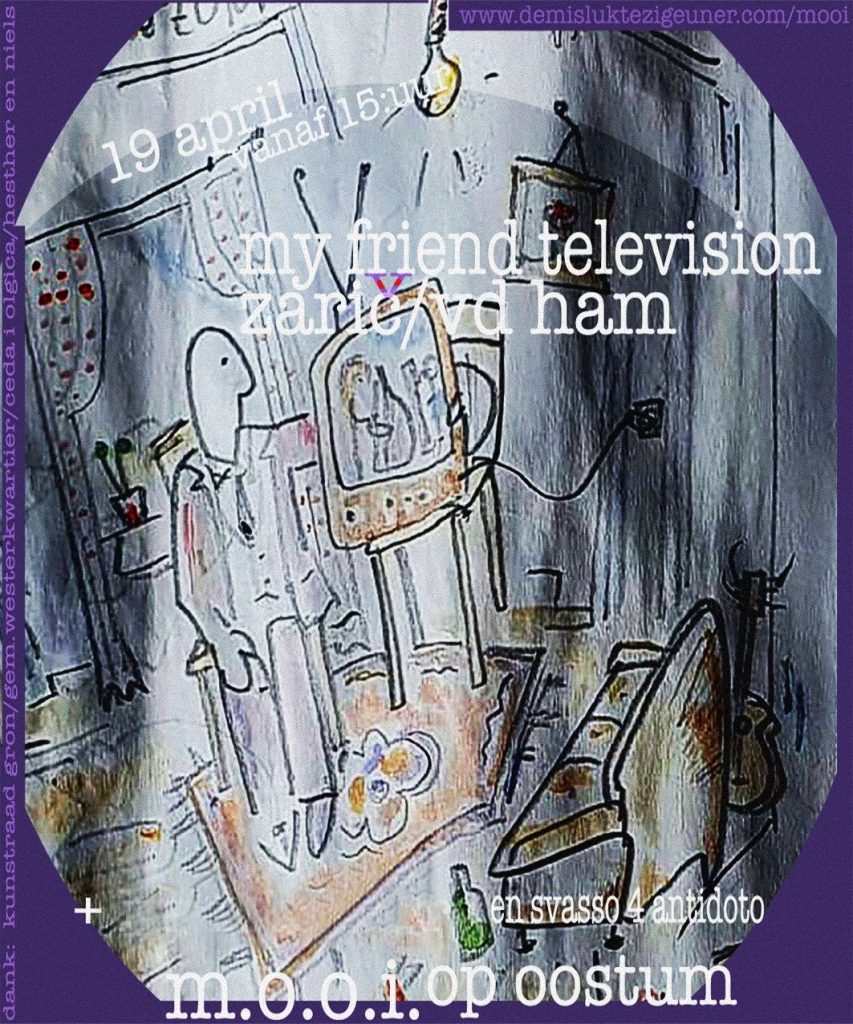 19 april vanaf 15:00: MyFriendTelevision (Gron): punk van Ricky (vroeger ook Moonlizards…) en vrienden. JW vd Ham fagot en ander riet (Leens) Milana Zaric harp (den Haag/Belgrado) (en Bas Alblas Bas met HanskoMislzig accordeon en of gitaar.) (Gron/Bonn) kunst uit Bonn (in samenwerking met Flow/Schaumburg). Suppe von Svasso for Antidoto
