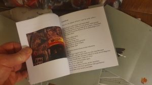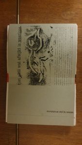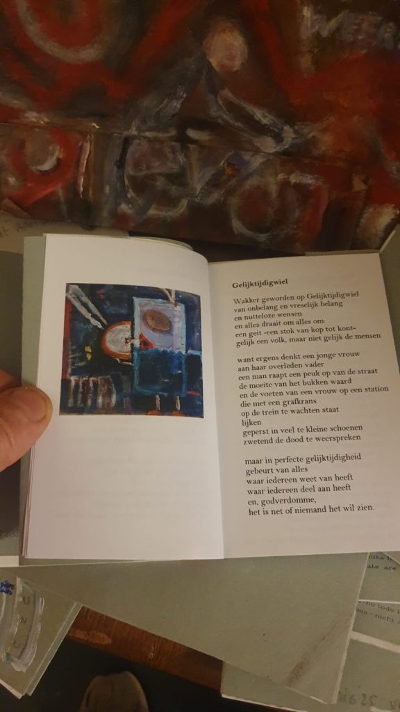 is eigenlijk twee boekjes, een breder en een smaller in een. met teksten en gedichten ( wat het verschil dan ook moge maken…) en een paar illustraties.